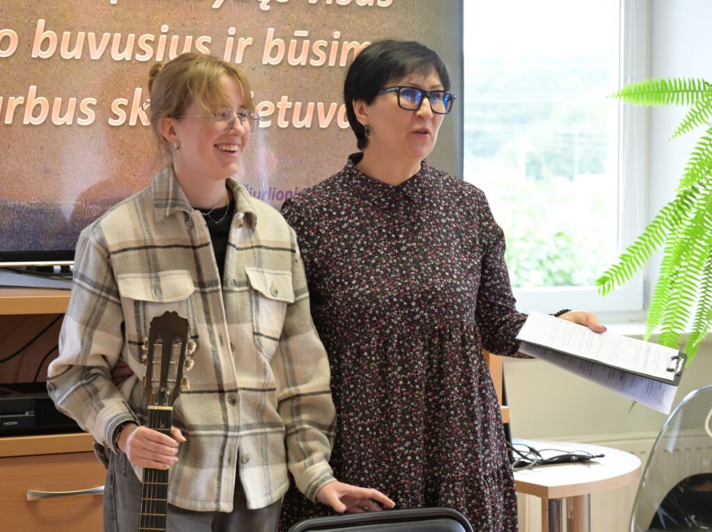 Pamokoje dalyvavo ir viešnios iš Vidiškių – Austėja Garnevičiūtė su mokytoja Audrone Krikščionaitiene. Austėja nustebino savo talentu: pristatė tekstilės darbą, pelniusį auksą Respublikinėje technologijų olimpiadoje „Kūrybos virusas 2025“ ir atliko savo dainą, sukūrusią ypatingą šventės atmosferą.