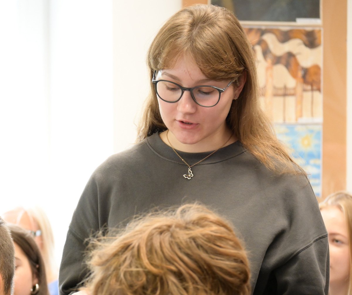 Pamokoje dalyvavo ir viešnios iš Vidiškių – Austėja Garnevičiūtė su mokytoja Audrone Krikščionaitiene. Austėja nustebino savo talentu: pristatė tekstilės darbą, pelniusį auksą Respublikinėje technologijų olimpiadoje „Kūrybos virusas 2025“ ir atliko savo dainą, sukūrusią ypatingą šventės atmosferą.