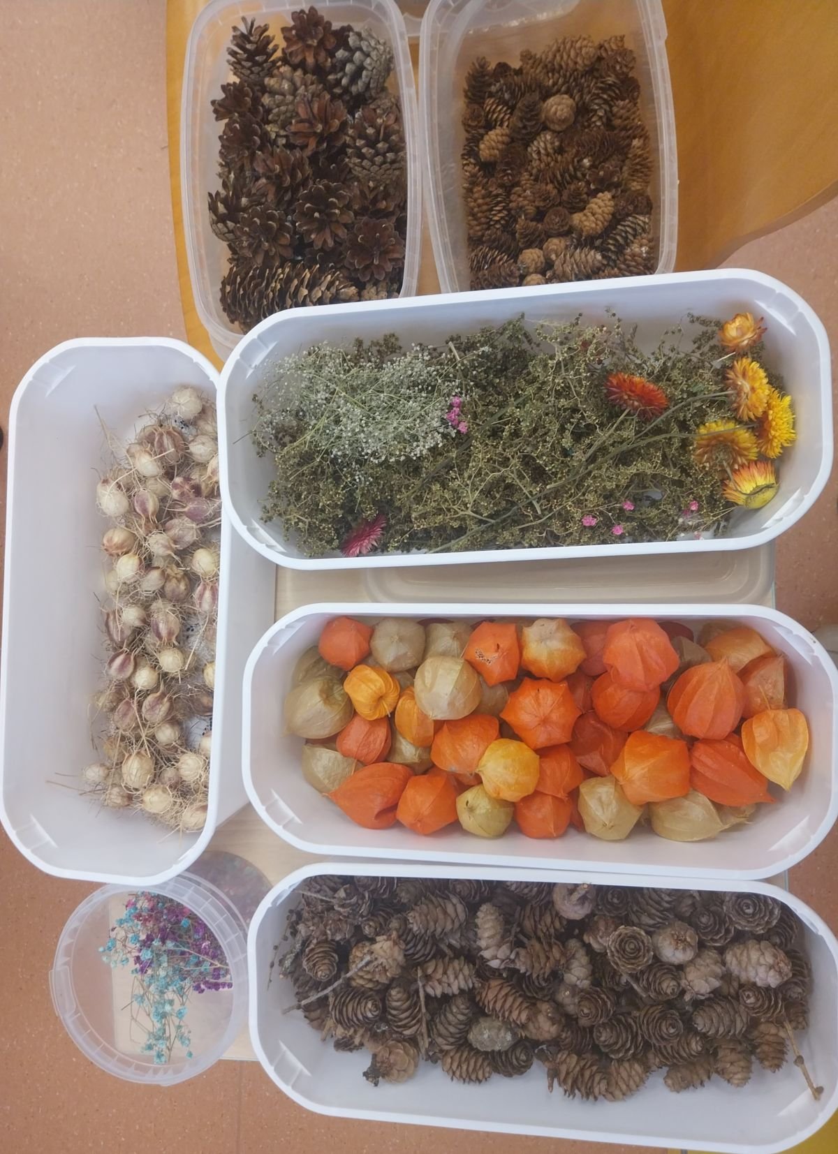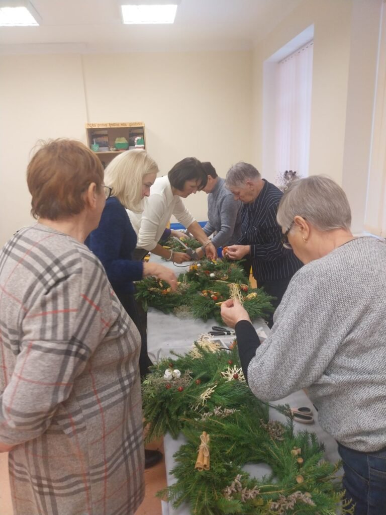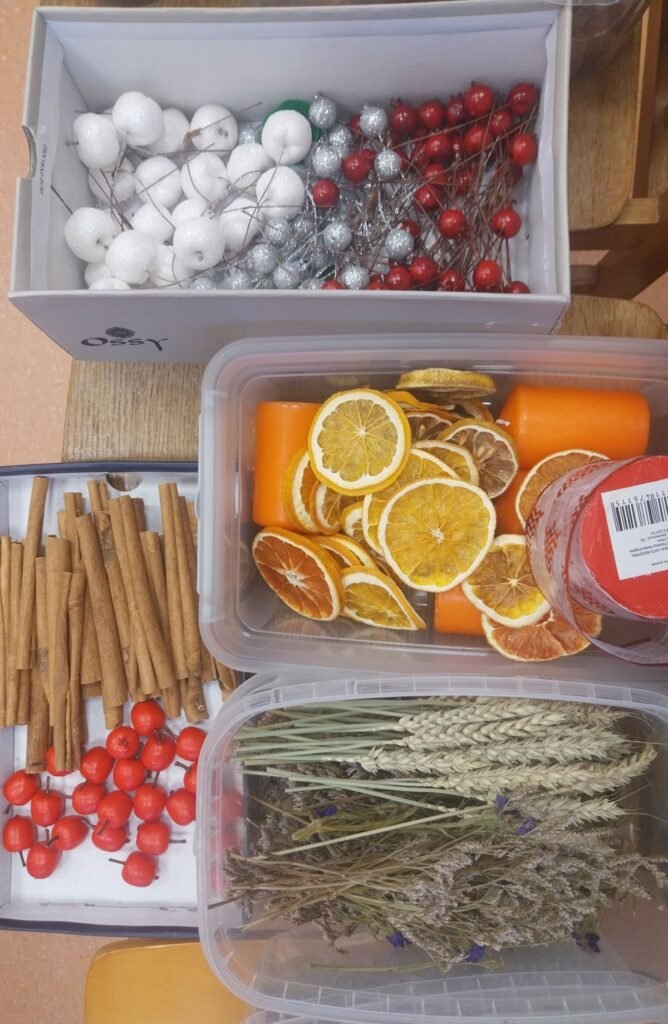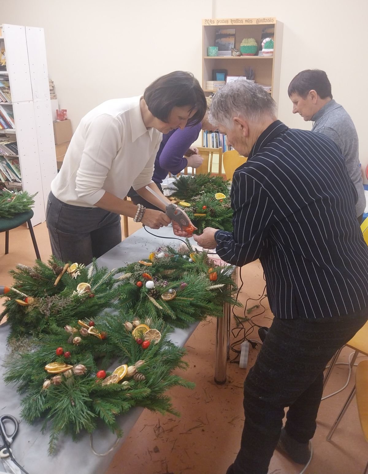 Vėliau su nekantrumu pradėjome mokytis vainikų pynimo gudrybių. Vainikus pynėme iš eglių šakelių, kurios simbolizuoja gyvybę, o papuošimui viešnia atvežė gausybę gamtos dovanų – sausų gėlių, kankorėžių, kaštonų, citrusinių vaisių riekelių. Renata kantriai dalijosi patarimais, tad netrukus galėjome džiaugtis puikiais rezultatais.
