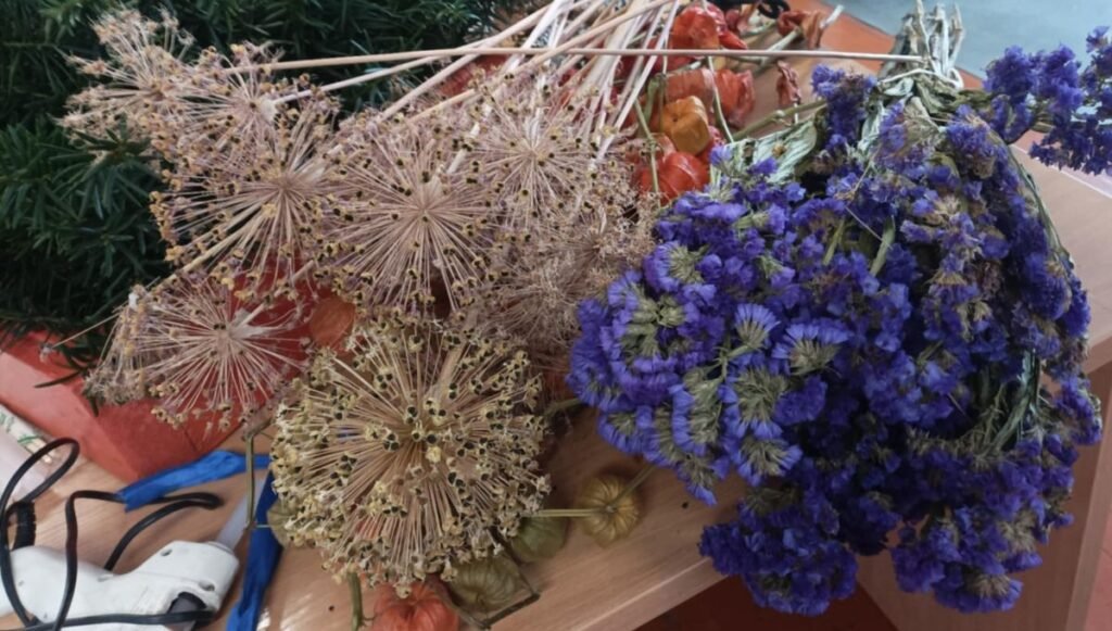 Tą popietę mus sujungė ne tik bendras darbas, bet ir prisiminimai. Tylos minute pagerbėme ilgametę Mielagėnų mokyklos biologijos mokytoją, gilūtiškę floristę Klotildą Duniauskienę. Atrodė, kad jos buvimas vis dar čia – tarp mūsų, tarp spalvotų kaspinų, eglių šakų ir kruopščiai parinktų uogų. Klotildos dovanoti floristikos žurnalai gulėjo ant stalų lyg tylūs patarėjai. Pavartę juos radome daugybę idėjų – spalvų derinių, kompozicijų, formų, kurias kiekvienas savaip perėmėme ir prisitaikėme.
