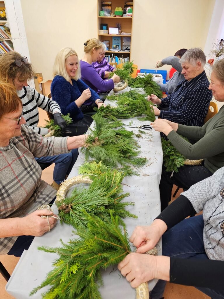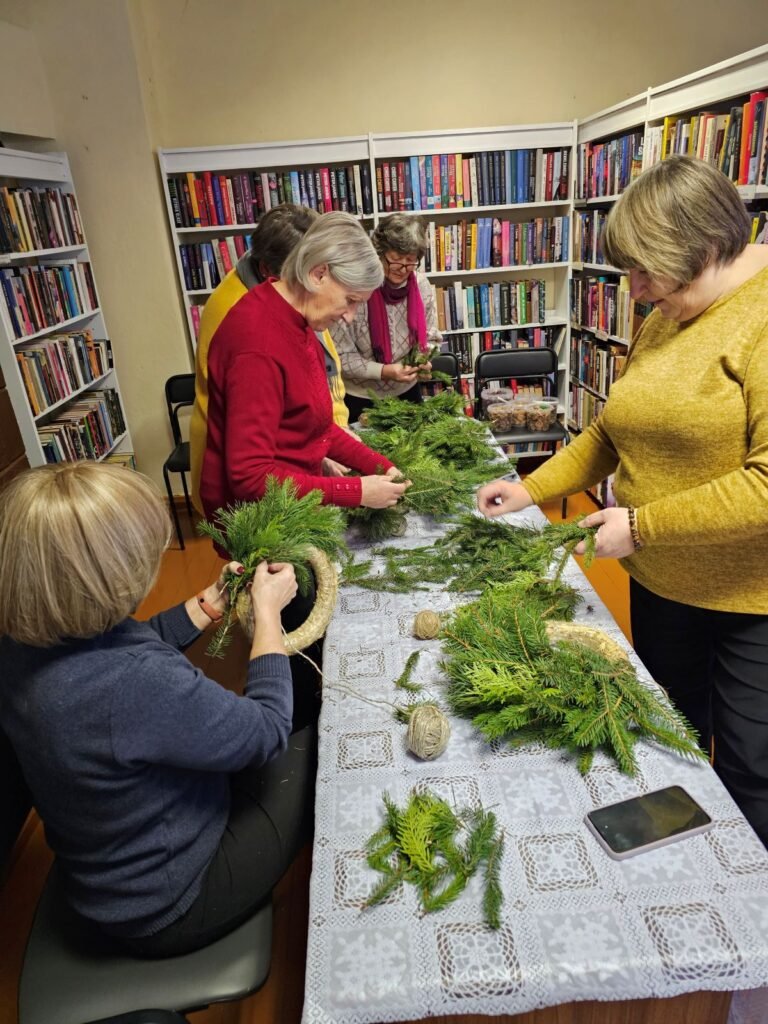 Bibliotekų erdvėse tvyrojo eglišakių kvapas, švelnus šurmulys ir ramūs pokalbiai apie Advento tradicijas, pasiruošimo prasmingumą, šeimos papročius. Dirbtuvių dalyviai pynė vainikus iš natūralių eglių šakelių ir įvairių papuošimų, o jų rankose gimstantys darbai tapo mažais šviesos, vilties ir laukimo simboliais. Kiekvienas vainikas buvo savitas – atspindintis kūrėjo nuotaiką, kūrybiškumą ir tai, kuo gyvena širdis šiuo ypatingu metų laiku.