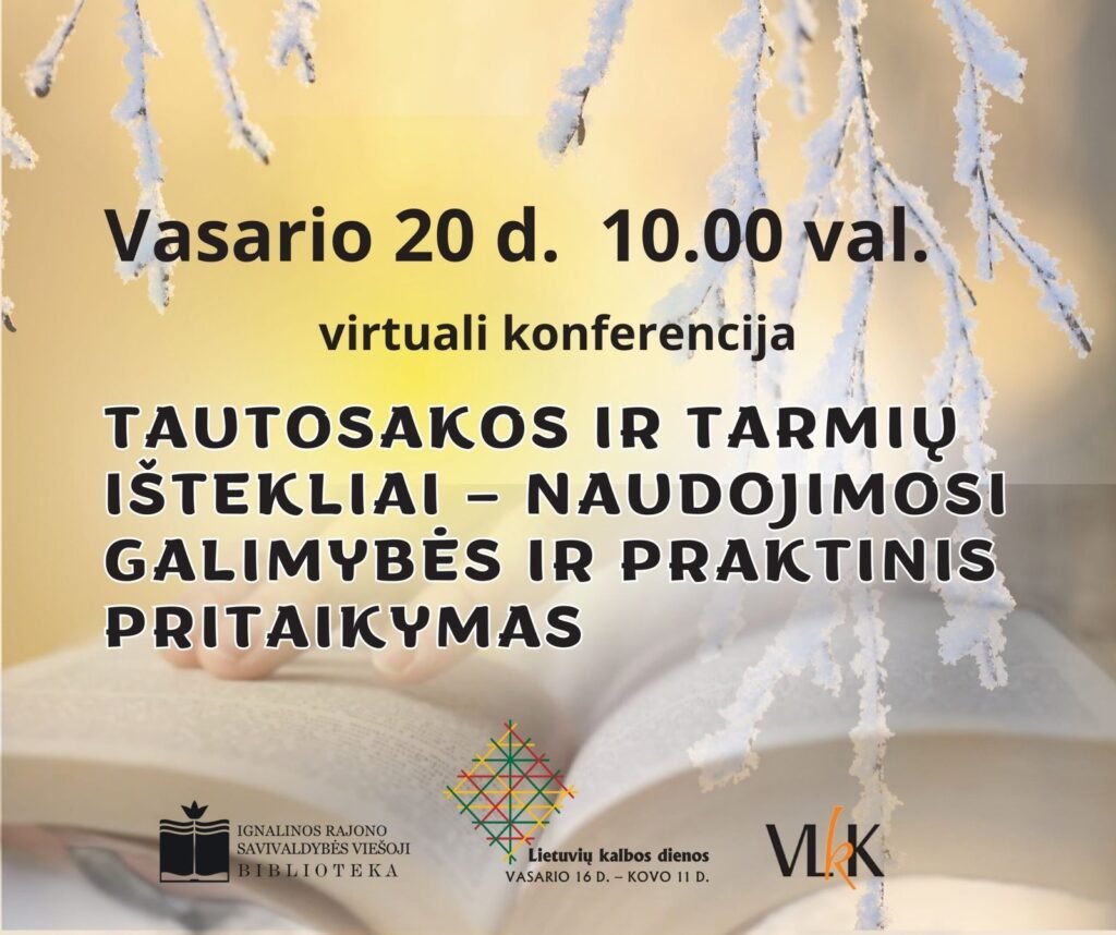 Kviečiame dalyvauti virtualioje konferencijoje „Tautosakos ir tarmių ištekliai – naudojimosi galimybės ir praktinis pritaikymas“! Konferencijos programa 10.00–10.10 Sveikinimai 10.10–10.30 Jurga Trimonytė Bikelienė (Lietuvių literatūros ir tautosakos institutas) Lietuvių literatūros ir tautosakos instituto skaitmeniniai ištekliai 10.30–10.50 Agnė Čepaitienė, Simona Vyniautaitė (Lietuvių kalbos institutas) Tarmių duomenys: nuo rankraščių iki išmaniojo archyvo 10.50–11.10 Jolita Urbanavičienė (Lietuvių kalbos institutas) […]