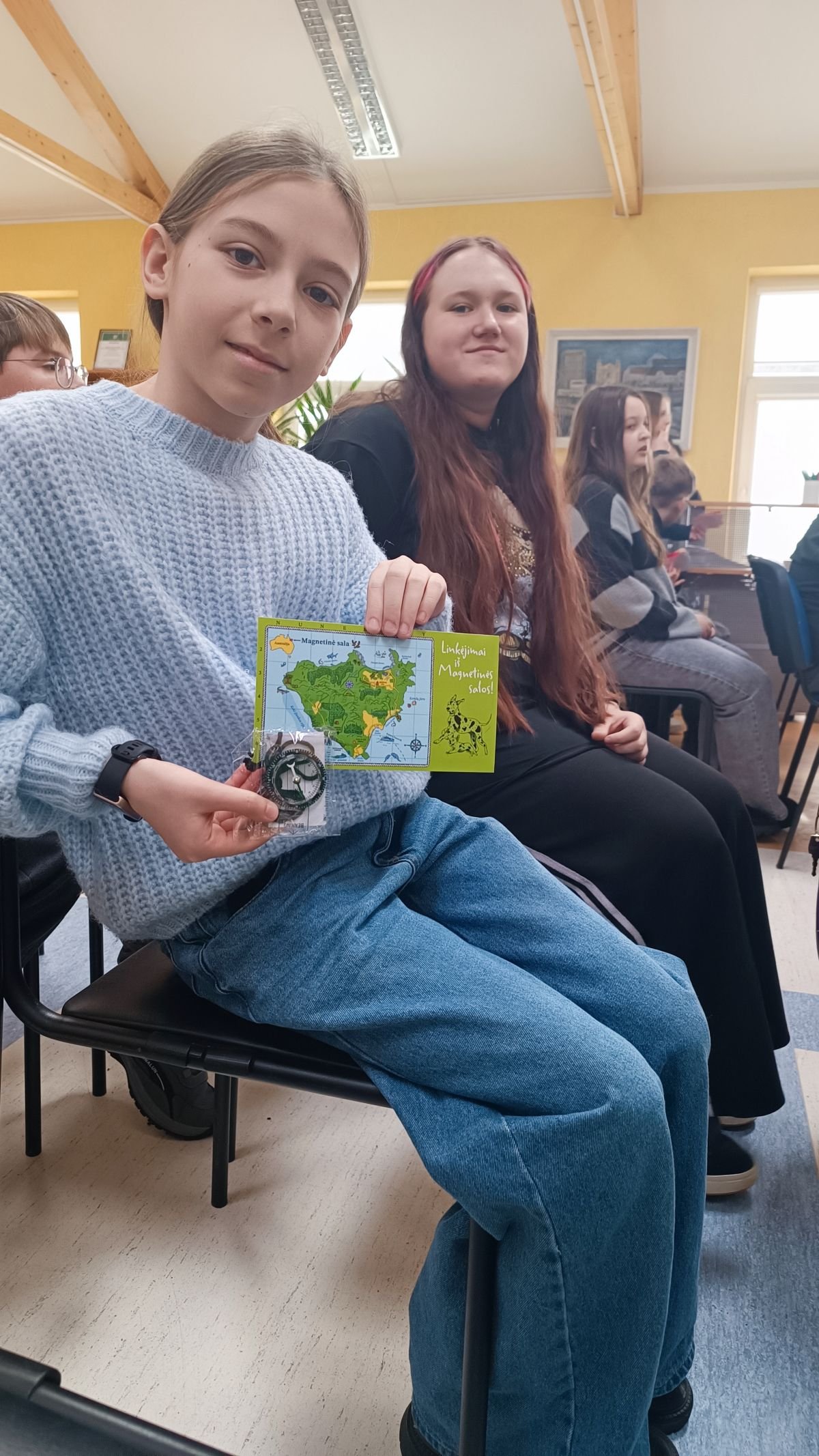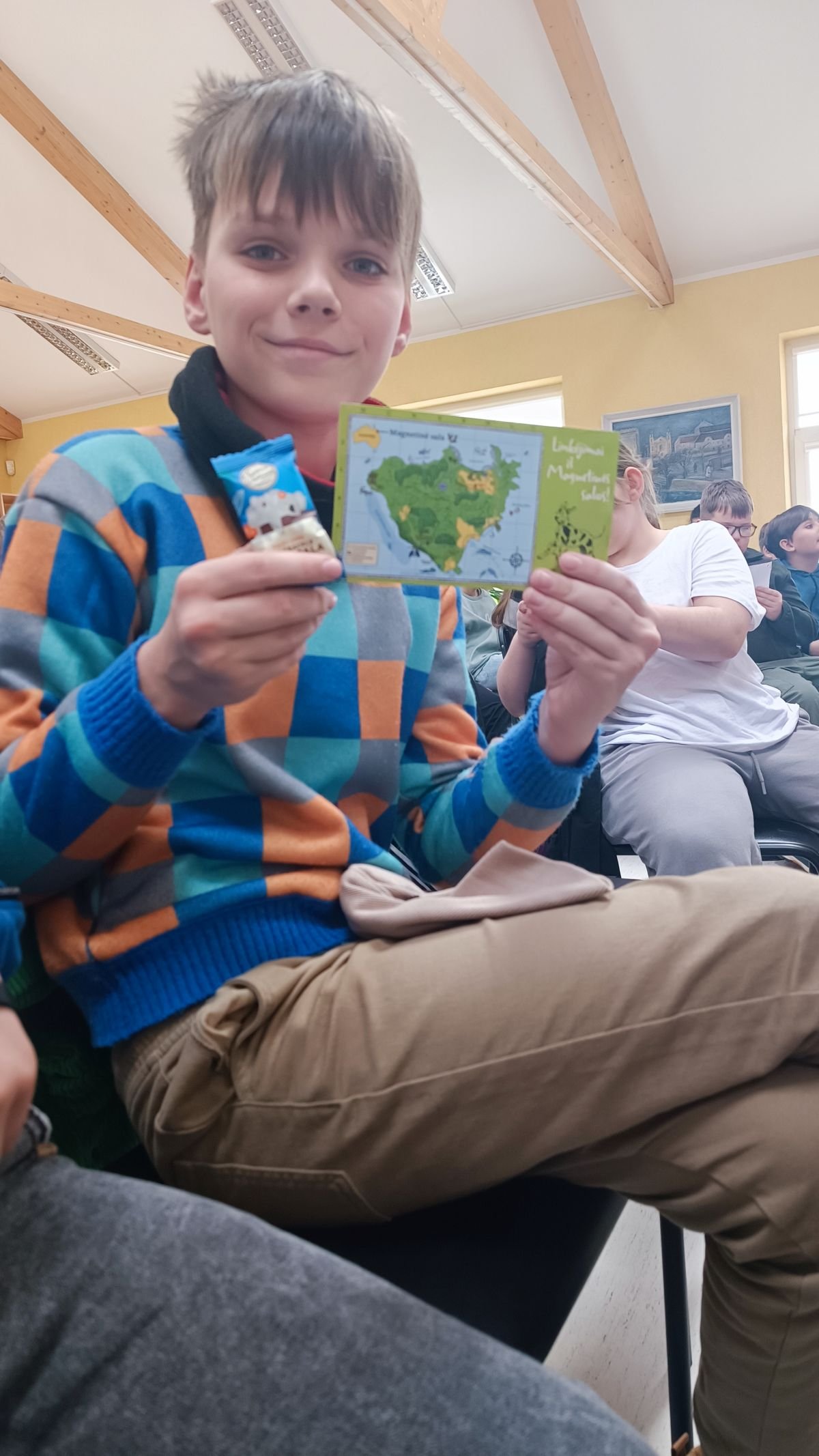 Didelio susidomėjimo sulaukė ir knygoje esančios užduotys bei mįslės. Skaitytojai gali spręsti galvosūkius kartu su Ema, o jei prireikia pagalbos – knygos pabaigoje randa atsakymus. Susitikimo metu mokiniai patys išbandė įvairias užduotis: sprendė šifrą, aiškinosi nematomų raidžių paslaptis, susipažino su Polibijaus kvadratu, apžiūrėjo ir rankose palaikė tikrą bumerangą.