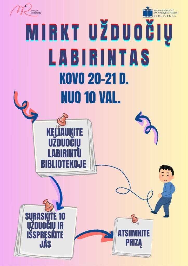 Kovo 20-21 dienomis nuo 10 valandos bibliotekoje vyks MIRKT užduočių labirintas. MIRKT – tai medijų ir informacinio raštingumo kompetencijų tobulinimo programa, kurią įgyvendina visos Lietuvos viešosios bibliotekos.