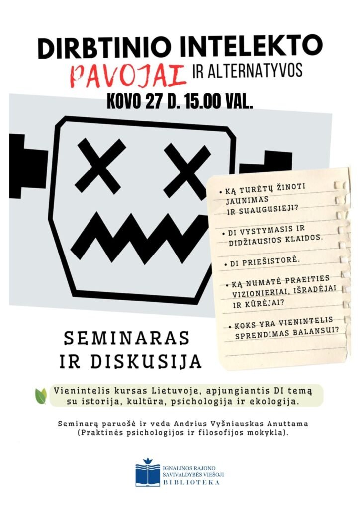 27 dieną 15 00 valandą kviečiame į lektoriaus Andriaus Vyšniausko seminarą ir diskusiją „Dirbtinio intelekto pavojai ir alternatyvos“.