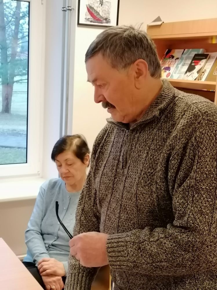 Lapkričio 21 d. bibliotekoje įvyko įdomus skaitytojų klubo susitikimas su krašto šviesuoliu, kraštotyros entuziastu Aldonu Laurutėnu. Dar 2024 m. prie buvusios Dysnos mokyklos jis pastatė atminimo akmenį pirmajam Dysnos vardo paminėjimui 1514 m., o vasarą šalia jo atidengė paties pagamintą stendą su kruopščiai surinkta informacine medžiaga apie Dysnos kaimą. Daug kur Aldonas rėmėsi mamos užrašais. Visą turimą autentišką medžiagą gražiai įrišęs, šviesuolis padovanojo ją bibliotekai, papasakojo, kaip įgyvendino savo sumanymus. Vartydami medžiagą, susirinkusieji stebėjosi puikia, turtinga paprastos kaimo moters kalba, taikliomis gyventojų charakteristikomis. Iš kartos į kartą einantį pomėgį domėtis krašto istorija Aldonas, matyt, ir bus paveldėjęs iš mamos. Už tokią prasmingą, nesavanaudišką veiklą jam dėkojo ir atminimo dovanėles įteikė ne tik bibliotekininkės, bet ir UAB „Birvėtos tvenkiniai“ direktorė Edita Brukštuvienė, visada palaikanti krašto istorinės atminties saugojimą.