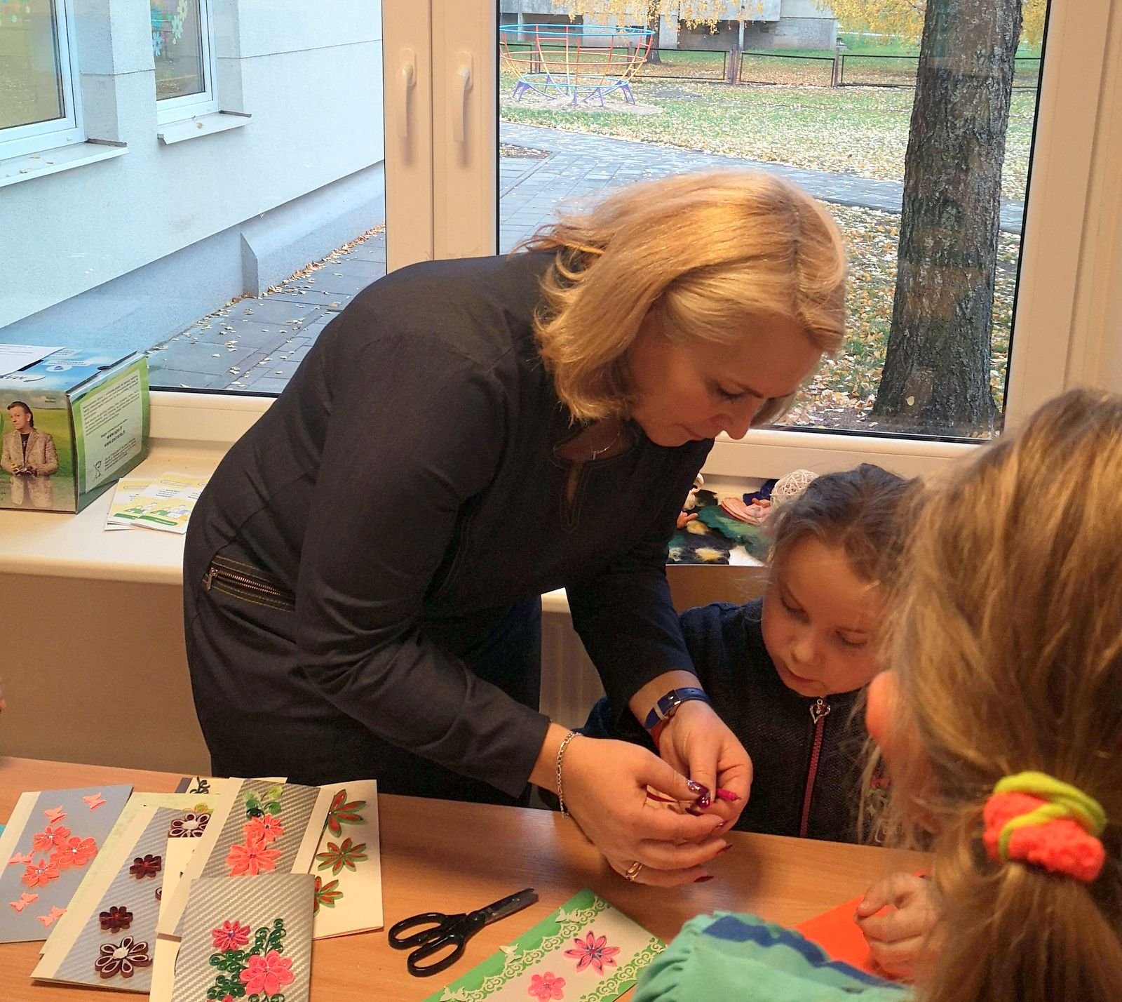 Jau kelis metus Stasytė kuria atvirukus naudodama šią techniką. Savo įgūdžiais ji mielai sutiko pasidalinti edukaciniame užsiėmime. Panorusius šią popietę praleisti bibliotekoje ir išmokti kvilingo paslapčių, S. Baranauskienė mokė, kaip sukti popierių, kokias priemones naudoti, kaip kurti įvairias formas rankomis spaudžiant popieriaus juosteles. Vaikai, susipažinę su kvilingo pradmenimis, entuziastingai ėmėsi kūrybinio darbo, stengėsi, kad popierius pražystų gėlių žiedais. Aišku, tai tik pirmoji pamoka, todėl ne viskas lengvai ėjosi, ne visi sumanymai buvo įgyvendinti. O popietė prabėgo taip greitai…