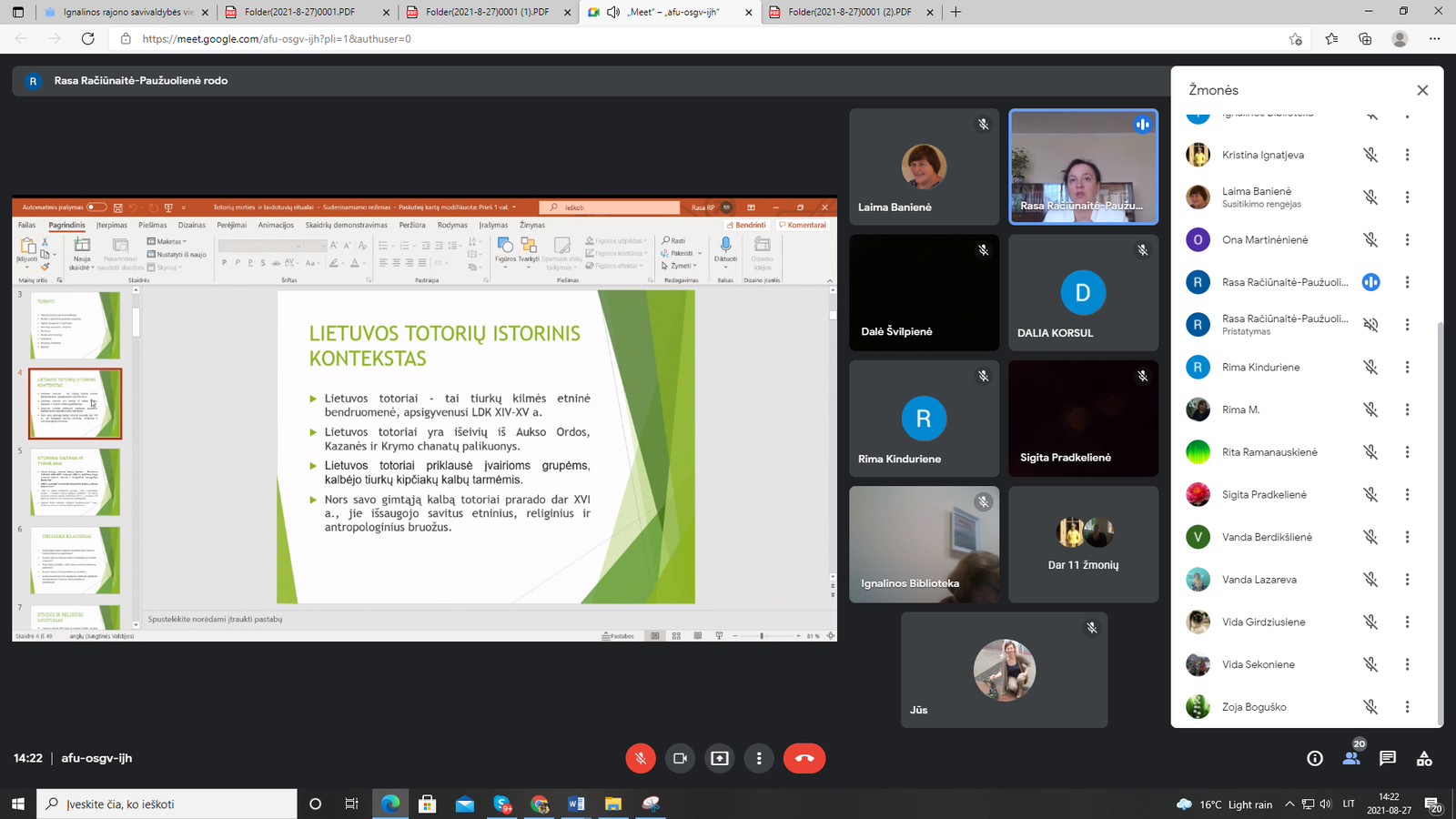 Lietuvos Seimas 2021-uosius paskelbė Lietuvos totorių istorijos ir kultūros metais. Ignalinos rajono savivaldybės viešoji biblioteka projektu „Totorių istorija žadina vaizduotę“, dalinai finansuojamu Lietuvos kultūros tarybos, siekia atkreipti dėmesį į totorių kultūros paveldą – istoriją, religiją, papročius, kulinarinį paveldą. Rugpjūčio 27 d. vyko dar vienas šio projekto renginys. Šis kartą – virtualus. Google Meet programos pagalba klausėmės paskaitos „Lietuvos totorių laidotuvių ir mirusiųjų minėjimo papročiai ( XX a. vid. – XXI a. pr.)“, kurią skaitė Kauno VDU mokslų daktarė, filologė, doc. Rasa Račiūnaitė-Paužuolienė. Lektorė supažindino klausytojus su Lietuvos totorių etniniu ir religiniu savitumu, plačiai papasakojo apie mirties ir laidojimo papročius totorių tikėjime. Lektorė taip pat supažindino ir su šių laikų Lietuvos totorių laidojimo papročiais. Transliacijos pabaigoje gerbiama Rasa atsakė į renginio dalyviams iškilusius klausimus. Į pokalbį įsijungusi Vilniaus apskrities totorių bendruomenės pirmininkė, orientalistė, turkologė, vertėja, humanitarinių mokslų daktarė, Galina Miškinienė, pasidžiaugė išsamiu lektorės pasakojimu, paminėjo dar keletą įdomių faktų apie Lietuvos totorių bendruomenę.